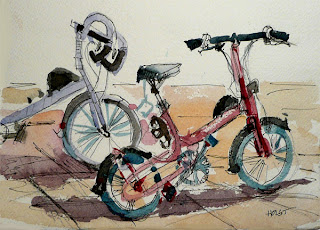 I was at the Park Blocks downtown just to see the activity because lots of streets were closed to cars. Only bikes and pedestrians could could follow the 6 mile loop linking SW Portland through The Pearl and into NW Portland. (Wallace Park) The whole event looks so family friendly; Kids on the back seat of Tandem bikes, Kids with training wheel bikes, and kids in bike trailers. I sketched these little folding travel bikes while I took a little break in the shade. The company that makes these is down in Eugene, called Bike Friday. They really looked slick and folded down to the size of a baby carrier in about 10 seconds. I think they picked great colors but you'll have to add lights and reflectors.